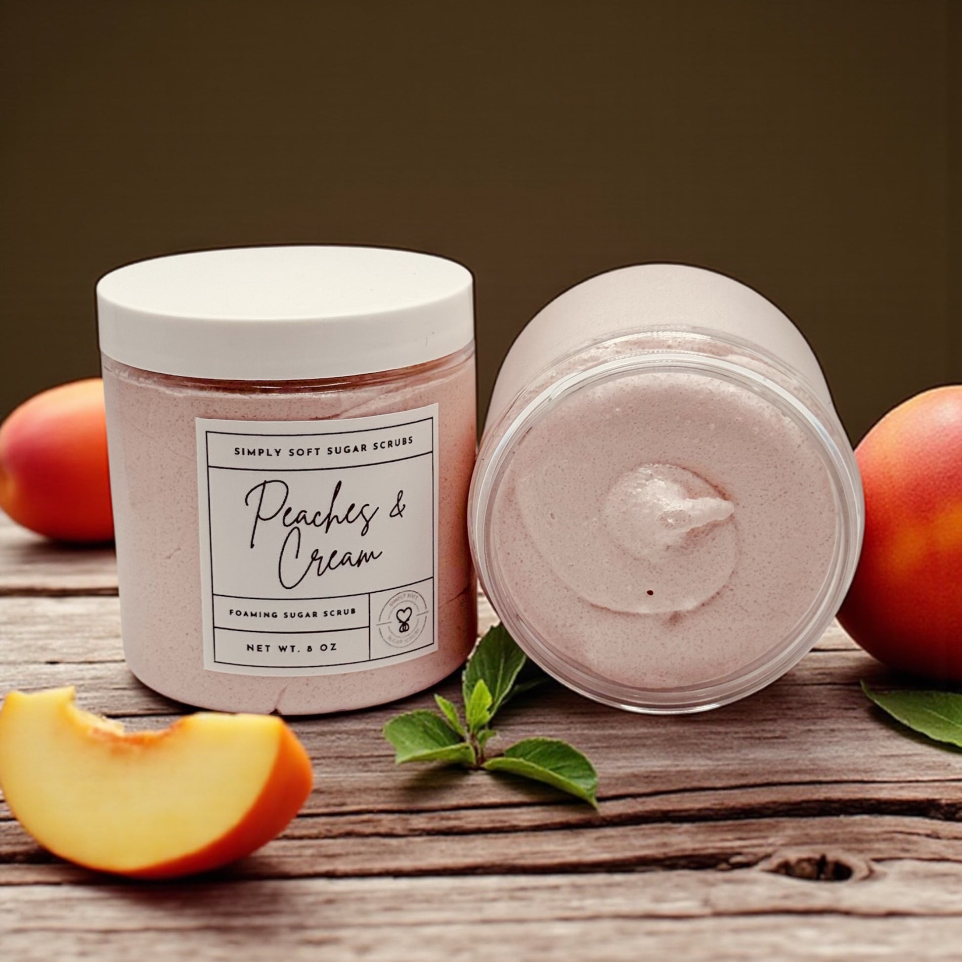 Whipped to perfection, this scrub exfoliates, nourishes, and cleanses all in one! Made with a creamy foaming bath butter, skin-loving jojoba oil, vitamin E, and sugar crystals, it gently buffs away dry skin while cleansing and leaving you soft, smooth, and glowing. Infused with the sweet scent of peaches & cream, it’s a treat for your skin and senses.