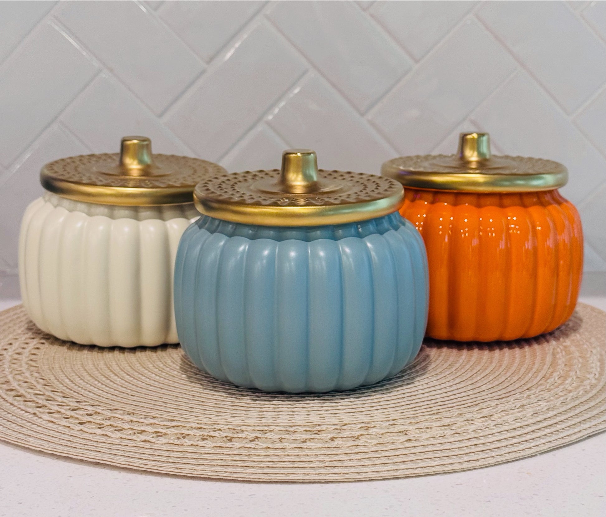 Scents include: Pumpkin Buttercream (orange), Almond & Vanilla (teal), and Whipped Lavender Creme (white)